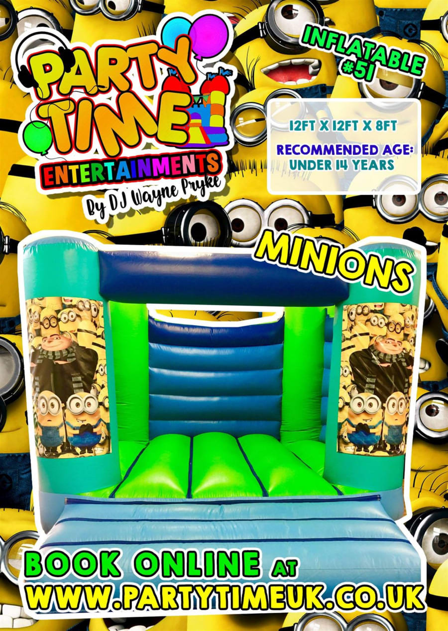This Minion bouncy castle from the popular film 'Despicable Me' & 'Minions' is popular with boys and girls and has a picture of Minions on both pillars. This Bouncy Castle provides your own little Minions with hours and hours of bouncing fun. It is extremely popular with boys & girls and brightly coloured making it ideal for all those fun parties!
