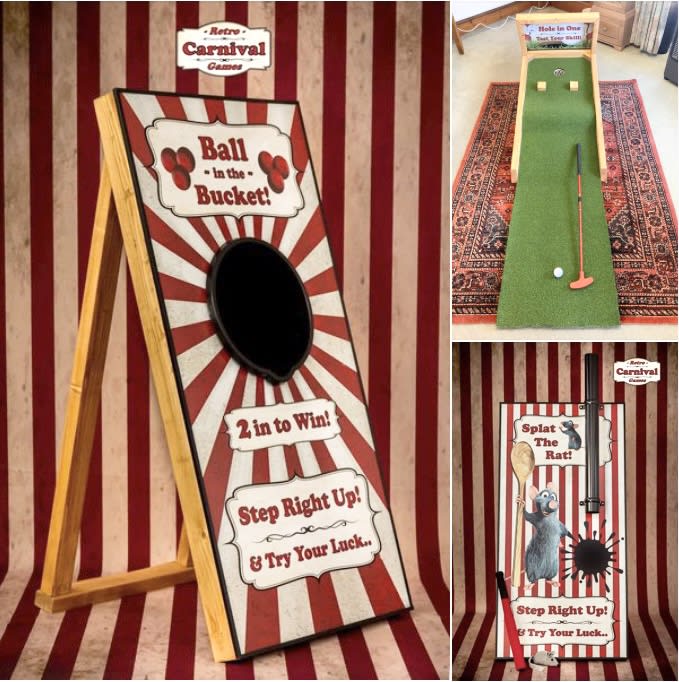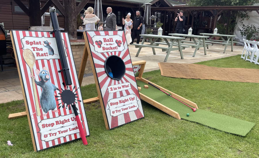 Roll up, roll up for all the FUN of the fair with a fantastic selection of traditional Fun Fair games! All our games are a great way to keep guests entertained! Can you throw the ball in the bucket? Can you get a hole In one? Can you Splat the Rat? All these games are perfect for all events, fetes, fundraising events, schools, community days, summer fayres, church groups, social events, anniversaries, open days, home parties, garden parties, events to raise money, nursing homes, clubs, groups, promotion days and lots more. Hire these as as a set of three! - Ball in the bucket Game 🏐 - Hole In One Game ⛳️ - Splat The Rat 🐀 These games require no electric so can be placed anywhere you like.