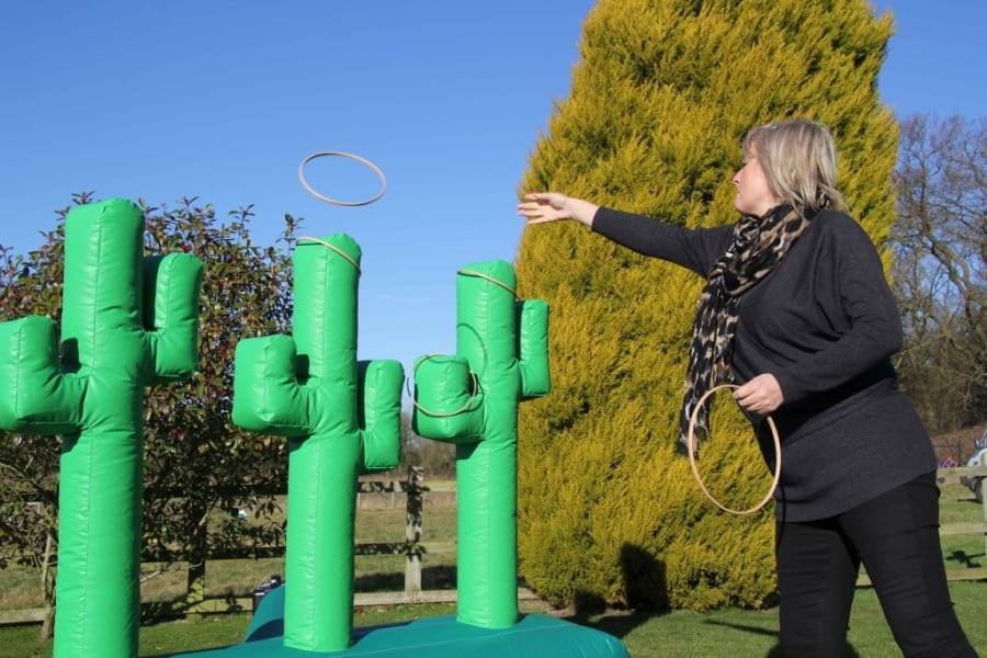 The 'Cactus Hoopla' is perfect for kids and adults who want to compete and see who can catch the most hoops on the inflatable cactus arms. Similar to the old fairground game, this is much more fun than throwing plastic rings over glass bottles and the inflatable is well designed And perfect on fun days, team building days and as an add on to any western themed rodeo party.